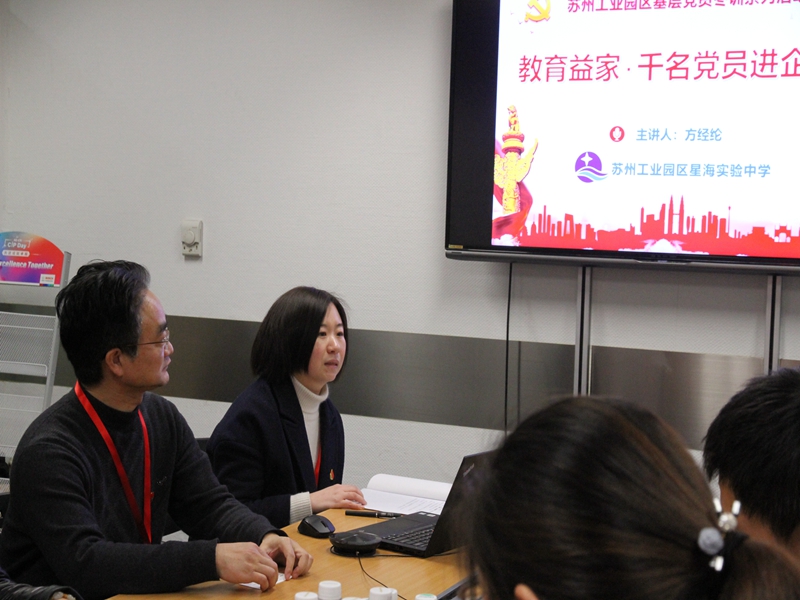 2月28日下午,星海实验中学党委委员、副校长邱建新携初中文科支部党员志愿讲师一行3人走进与亿滋食品(苏州)有限公司,为该公司和大东傲胜保健器(苏州)有限公司的党员同志做了冬训讲座。邱建新副校长为企业员工上了一节生动的主题党课,包括习近平新时代中国特色社会主义思想、习近平总书记在庆祝改革开放40周年大会上的讲话要点及中央经济工作会议精神要点等内容,有效提升了党员们的思想理论水平。初中文科支部书记陆琦老师结合自己的使用心得,详细介绍了“学习强国”APP的强大功能和使用方法,引导党员同志及时关注党的新举措、新思想,通过观看视频、阅读文章、答题考试、分享交流、观点发表等方式学习重要讲话,了解时事政治。