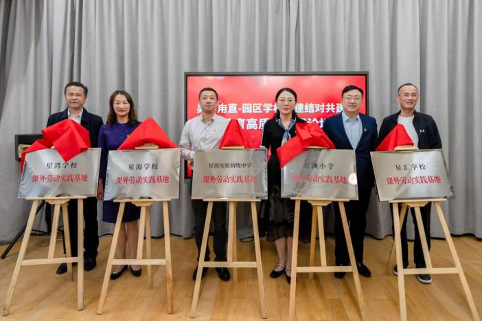活动现场,钱江书记应邀参与甪呦呦成长社区劳动实践基地挂牌仪式。星海实验初级中学始终将劳动教育作为五育融合、跨学科融合的突破口,构建以实践为主线的“星光1+3”融浸式劳动实践课程体系。此次校外劳动教育实践基地的又一建立,进一步丰富了学校劳动教育载体,探索劳动育人新成长点,让星海劳动课程绽放出“星”光彩。