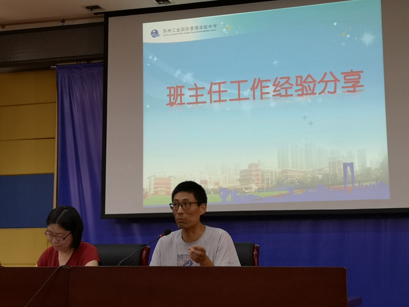 第一部分,德育工作表彰与经验分享。张明劼副校长为2017-2018学年第二学期26名校优秀班主任颁发奖状,宗轶丽、吕荣干老师分别作为优秀班主任、优秀班集体代表围绕班集体建设、班级文化建设做经验交流。 宗轶丽老师用感人的事例、深入地思考阐述了严慈并济的形象,张弛有度的管理方法,娓娓道来了平实却非凡的师生情谊,道出了教育人不忘初心的本真。吕荣干老师对班风进行了独特的概念解读,认为班风是一个场,是思想的外在表现,体现了水和鱼的关系,把作为班主任的自己理解为不是放水养鱼的人,而是与鱼共舞的人,以爱的名义与学生一起奔跑的人。班主任们得到了情感的共鸣、策略的交流、理念的升华。