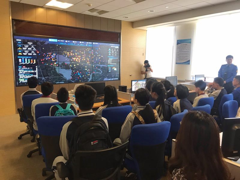 在综合执法大队的指挥室里,同学们认真聆听了执法队员对苏州工业园区城市管理工作的介绍,感受了从案件受理、立案、派遣到结案的高效过程,也被高清的路口实时监控画面所震撼。
