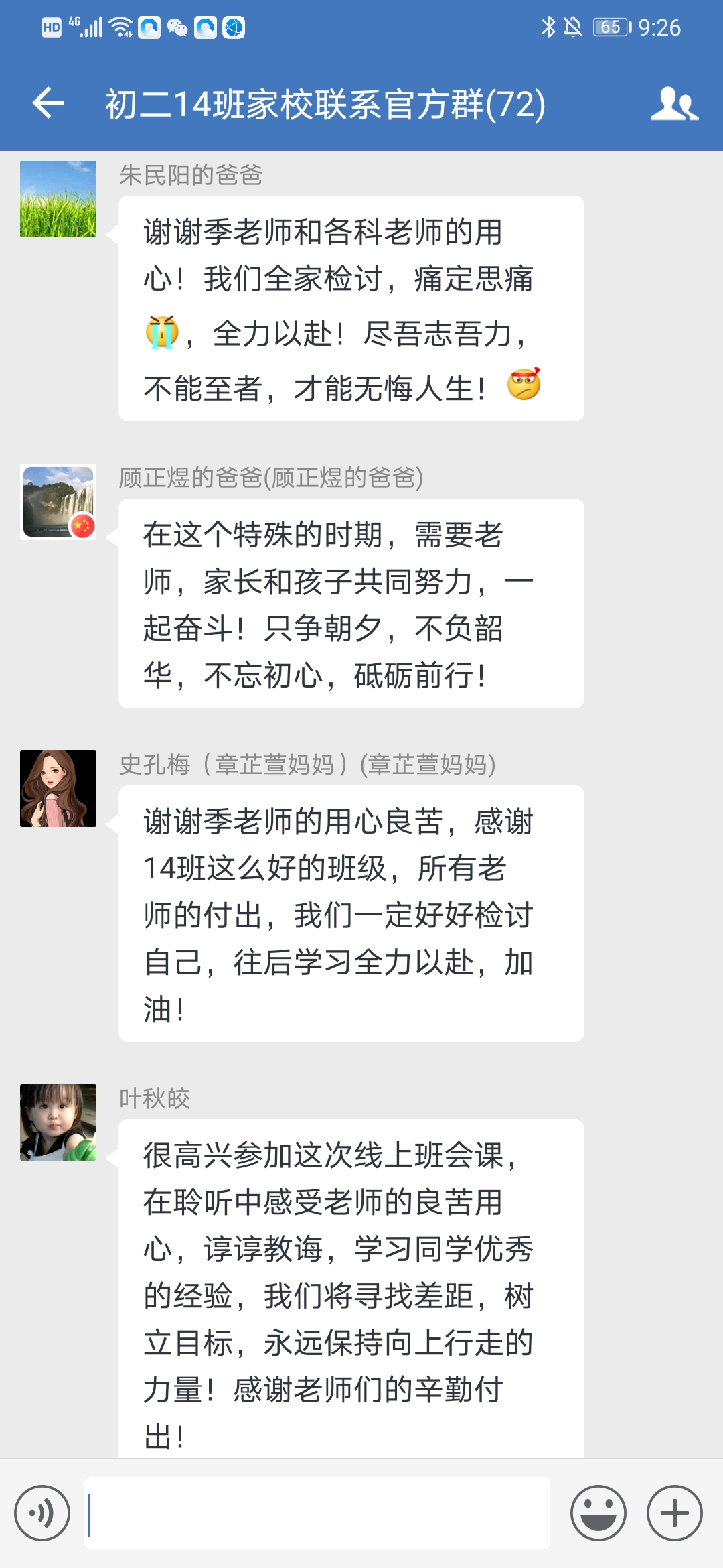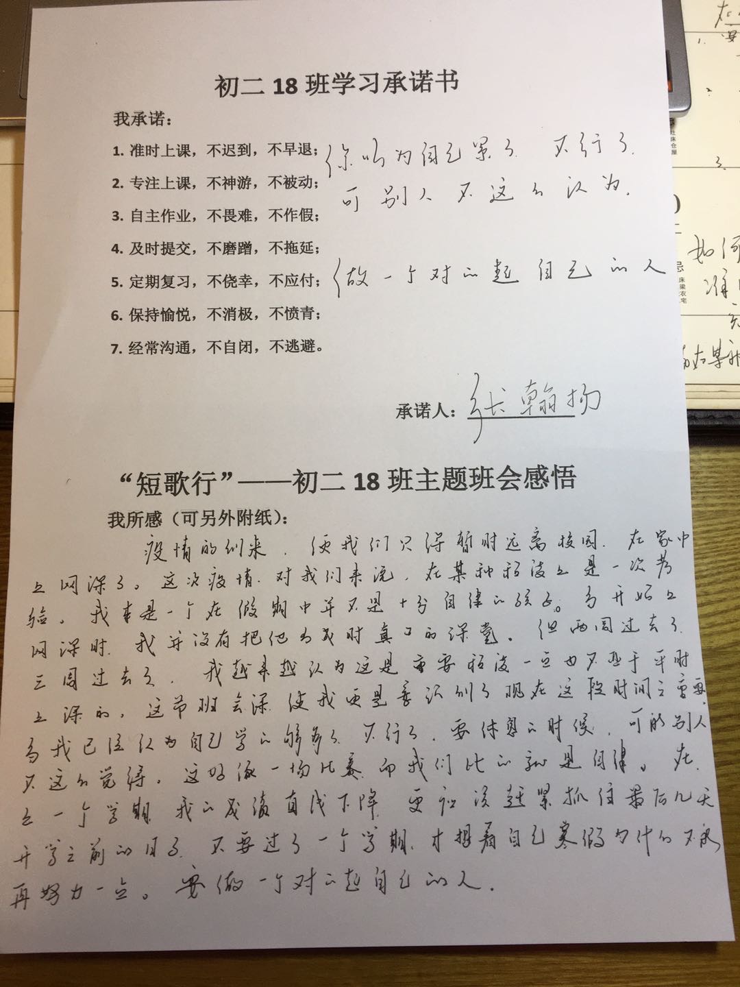 慨当以慷,忧思难忘——班级阶段要求。勤于反思,善于总结,令行如流,方能成事。在线学习亦需时时总结;居家期间也要遵守班规。挣断线的风筝不仅不会得自由,反而会一头栽向大地。孩子们必须拥有学习、休息的行事原则才能更好的度过这段特殊日子。因此,初二的班主任们为孩子们制定了居家学习期间的班级规约,提出了自己的殷殷盼望。孩子们以签署承诺书的形式,郑重表示遵守约定。