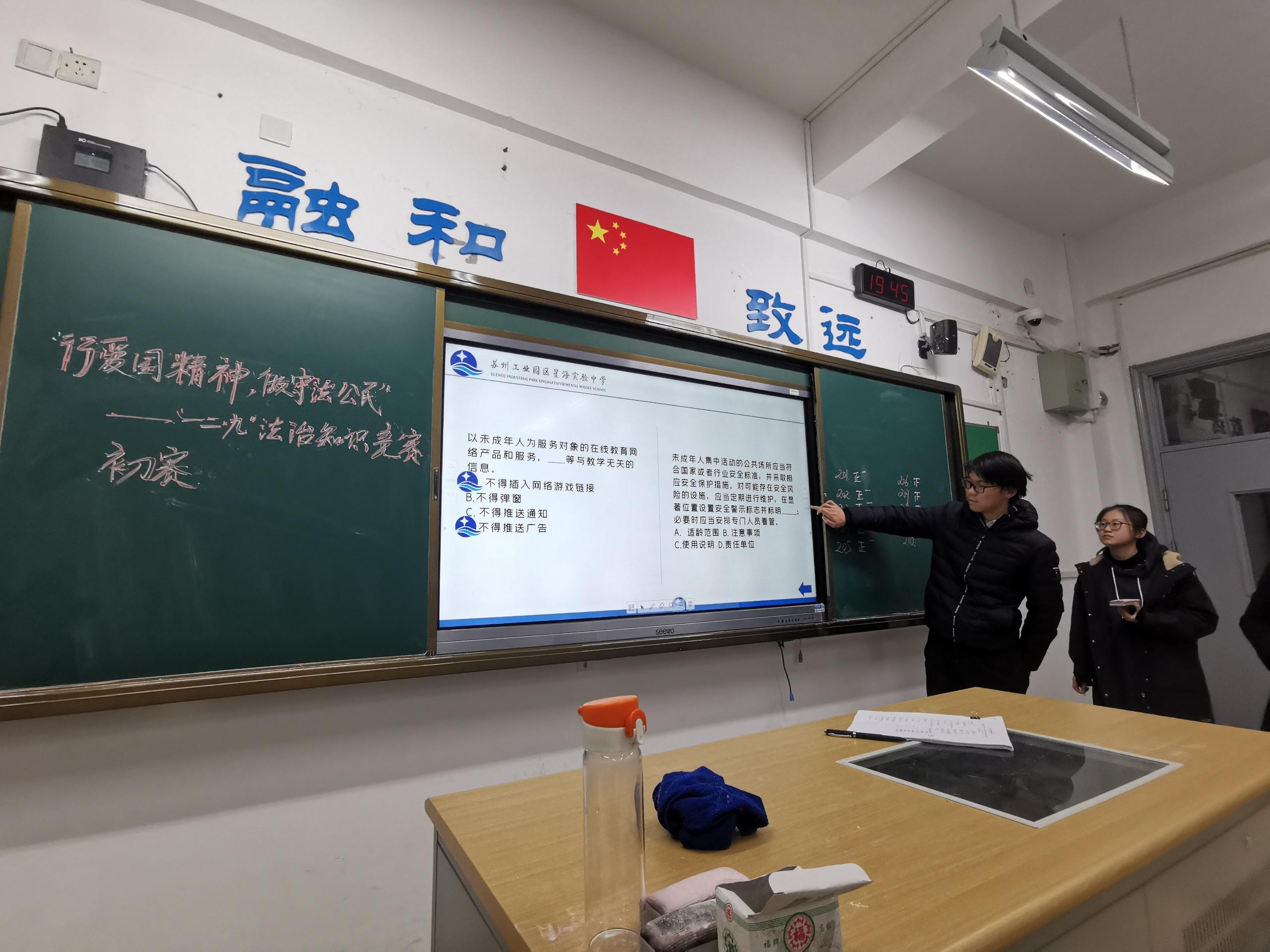 晚上,“行爱国精神,做守法公民”一二·九法治知识竞赛进行初赛,高二的同学们都做了精心准备,最终高二3、4、5、8、9班进入决赛,让我们期待他们更精彩的表现。