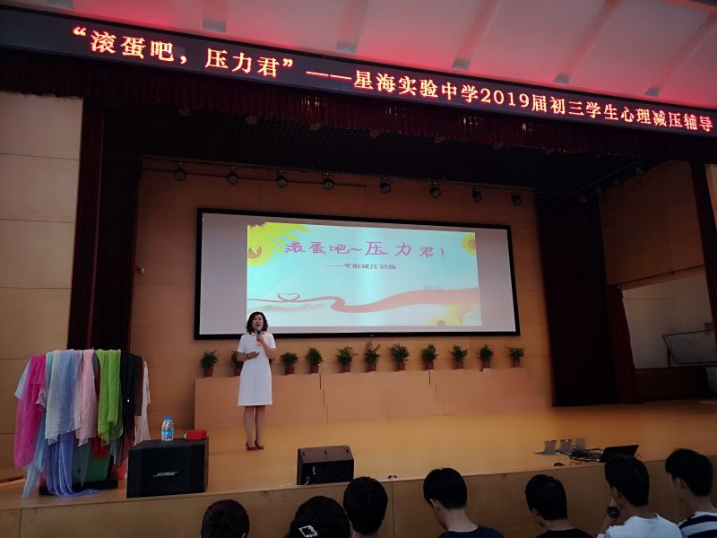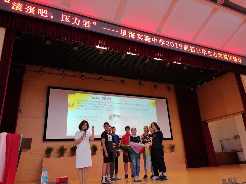 6月10日,中考来临前一周,苏州工业园区星海实验中学特别邀请中国心理卫生协会团体心理辅导与治疗专业委员会心理剧学组秘书长、临床与咨询心理学注册工作委员会注册心理师郝丹老师为2019届初三学生做心理减压专题辅导。
