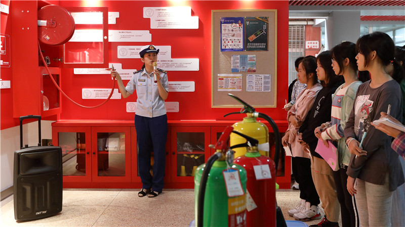 首先,园区消防大队的丁参谋详细为学生讲解了火灾的分类、灭火器的分类及使用方法、火灾发生后如何报警、逃生、自救等基本常识。丁参谋语言风趣、深入浅出,将消防知识与实际案例生动地结合起来,为学生们上了一堂生动的消防知识培训课。随后消防队员和学生用提问解答学生形成互动,并现场让学生进行知识问答,学生积极参与、气氛活跃,在寓教于乐中学习到了丰富的消防安全知识与技能。培训过后,年级组将安排学生代表对本班同学进行二次培训,充分发挥学生干部的示范引领作用,让更多的学生掌握消防安全知识和技能,在灾害来临时多一份逃生与救灾的本领。
