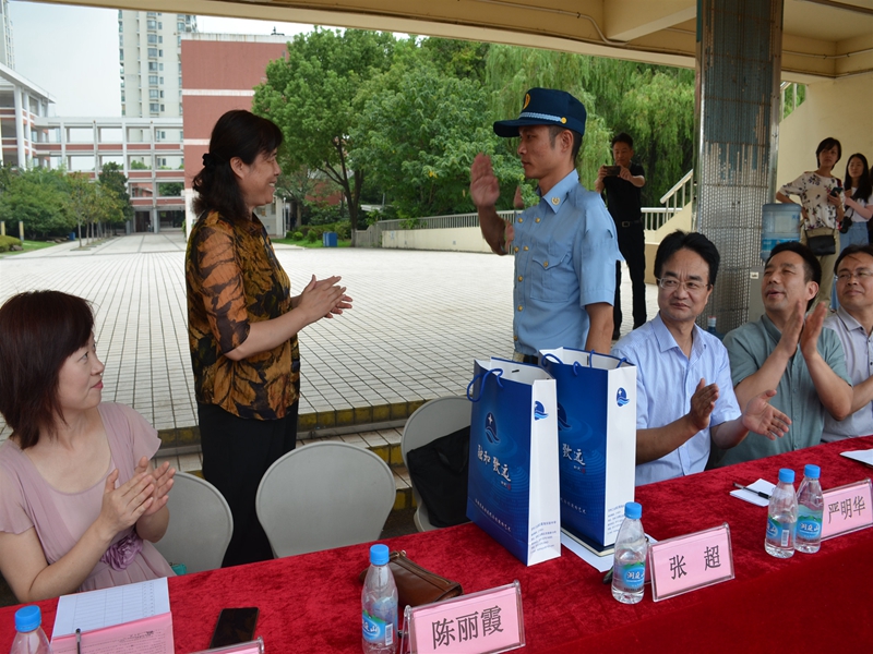 陈丽霞校长代表星海实验中学向部队总教官张少校赠礼。