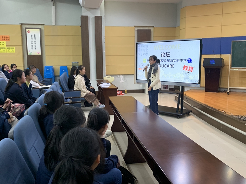 在以“中新教育对比”为主题的论坛上,同学围绕话题积极地陈述了自己的观点,并就课程设置、学业负担、兴趣培养等方面展开了热烈的讨论。经过对话,两校同学发现虽然她们学习的课程不一样,但她们的学习目标是一致的。并且,她们达成了共识:无论在哪里学习,努力是成功的关键。