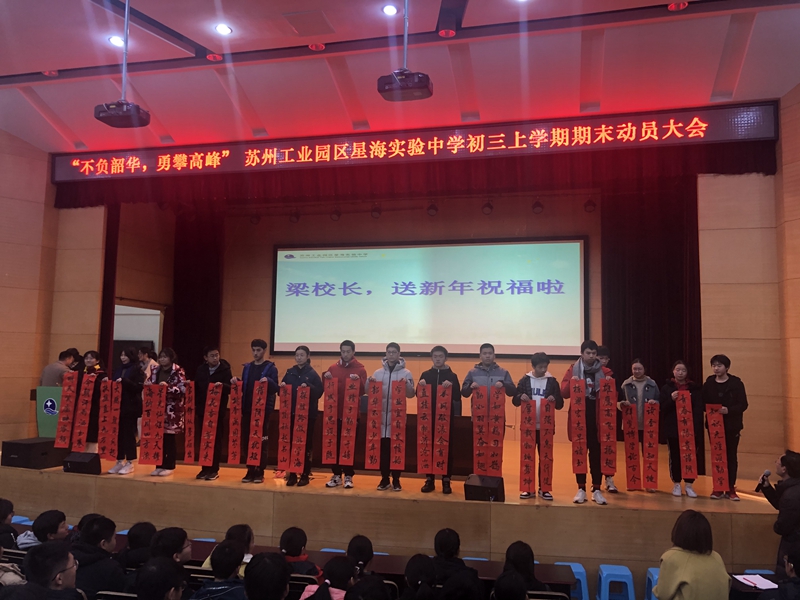 倾情呈现足显风华,传经送联更添年味。大会的最后,教导处戴小驹老师强调了期末考试作为区内第一次集体亮相的重要意义,鼓励大家要更加惜时、有计划,同时立足复习罗列了各科重点,为同学们传经送宝。梁军副校长更是连夜泼墨挥毫,现场为每个班送去手书春联,寄托美好寓意。陈丽霞校长也亲临现场,勉励同学们调整作息,保持状态,以踏实的行动践行人生理想;饮水思源,常怀感恩之心,用骄人成绩续写星海华章。