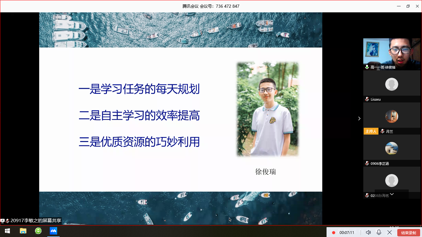 在“云”相遇环节,星海实验中学高一年级徐俊瑞同学分享优秀学生的学习经验,他谈到:学习任务要每天规划、自主学习要努力提高效率、优质资源要巧妙利用;随后,高一年级秦宇轩同学从初三下学期学习的计划、细化、强化等方面分享学习经验,他说到:明确并坚定目标、保证生活规律、制定合理学习计划、控制电子产品使用,在学习中特别重要。