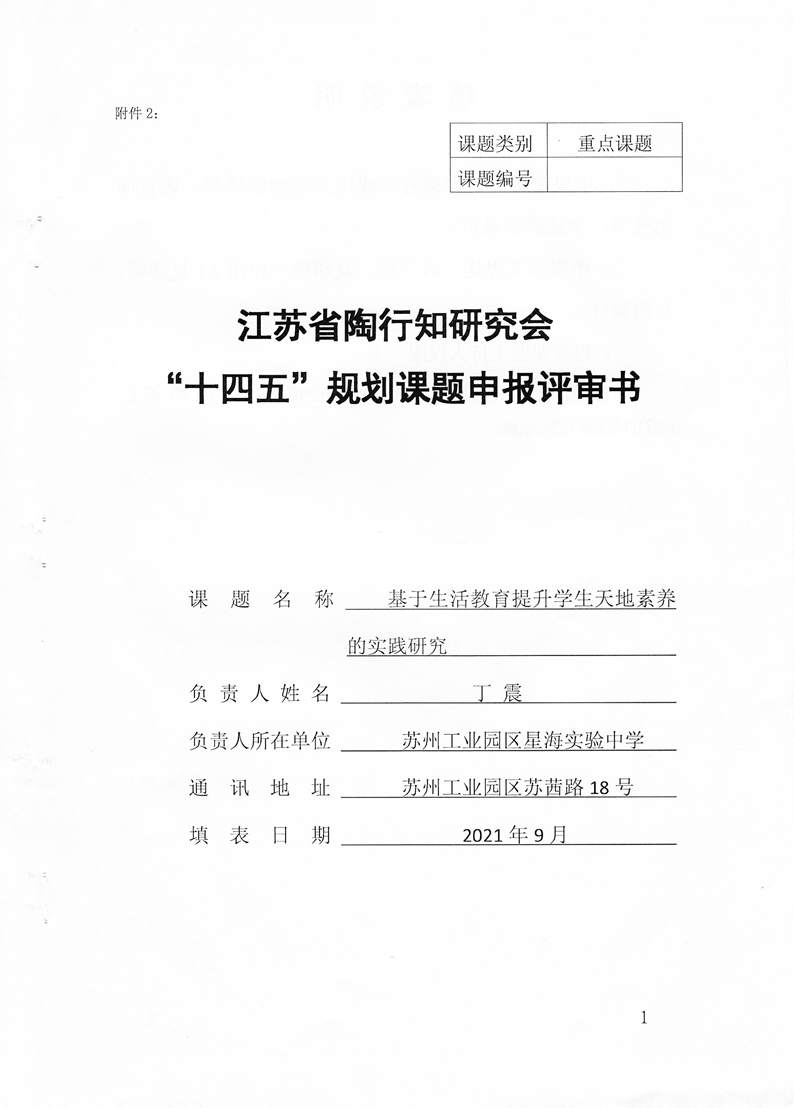 江苏省陶研会“十四五”重点课题《基于生活教育提升学生天地素养的实践研究》申报评审书