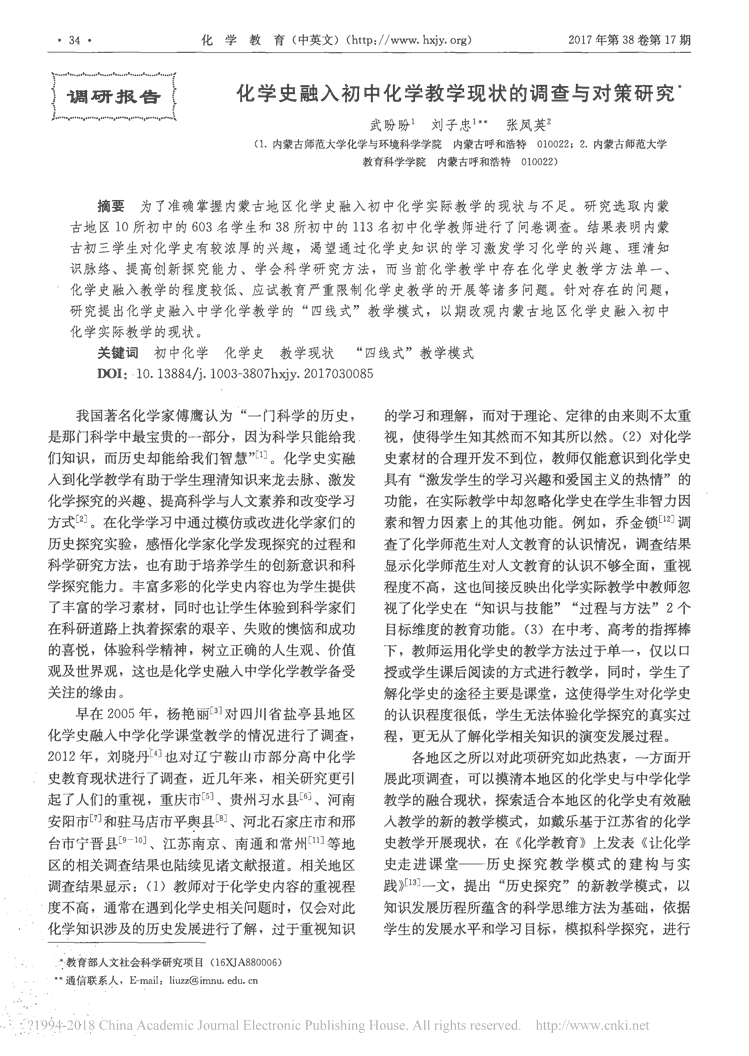 化学史融入初中化学教学现状的调查与对策研究_武盼盼