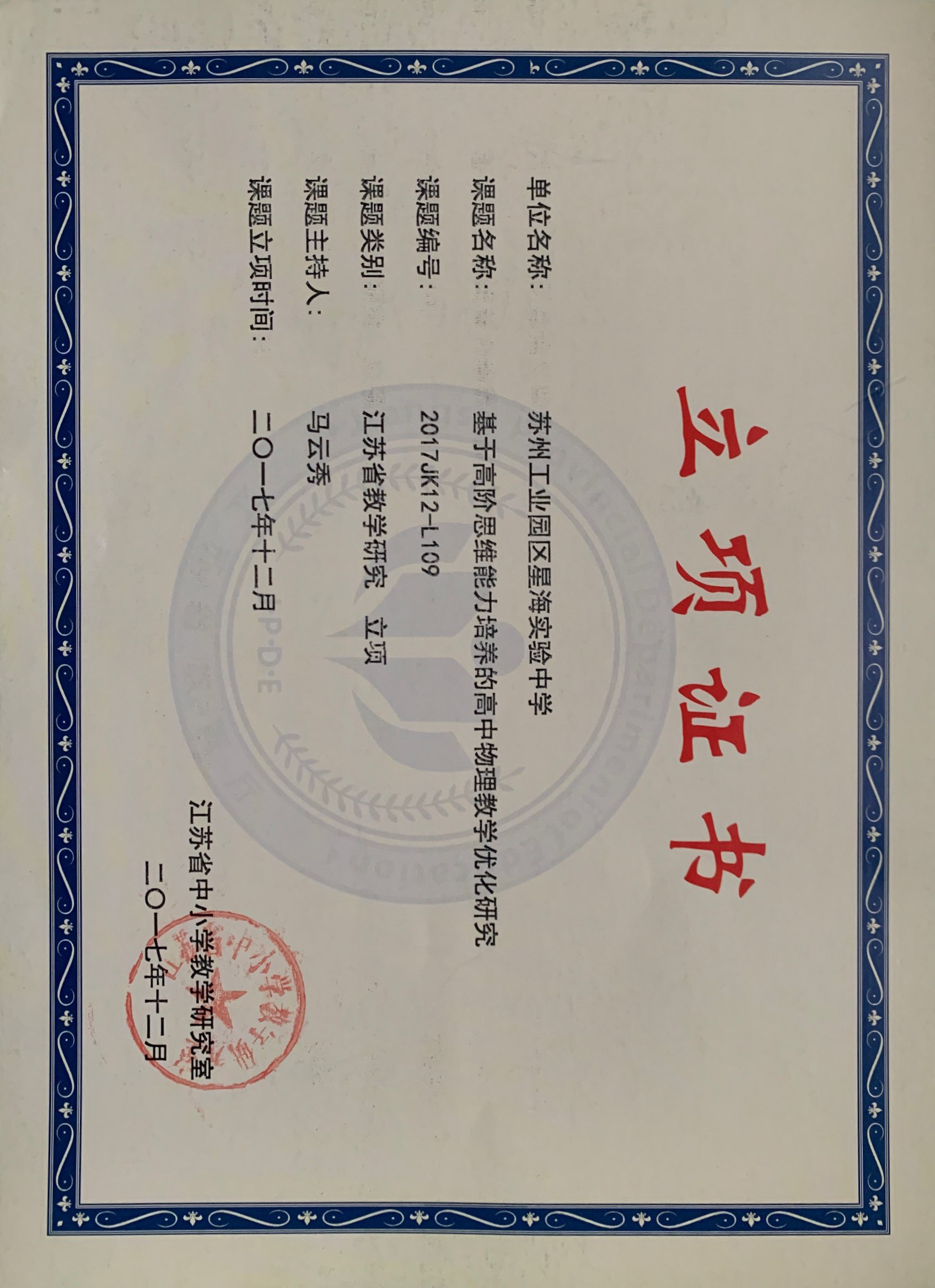 基于高阶思维培养的高中物理教学优化研究结题证书