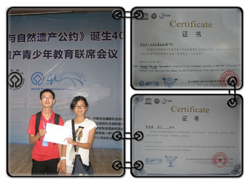8月3日—5日,由联合国教科文组织亚太地区世界遗产培训与研究中心主办的第四届世界遗产青少年教育联席会议在古都西安隆重举行。星海实验中学被评为“2010—2011双年度优秀世界遗产青少年教育基地”,高茗若和金戈两位同学参加了此次联席会议“我与世界遗产”中学生论坛,表现突出,被授予“世界遗产青少年保卫者”荣誉称号。